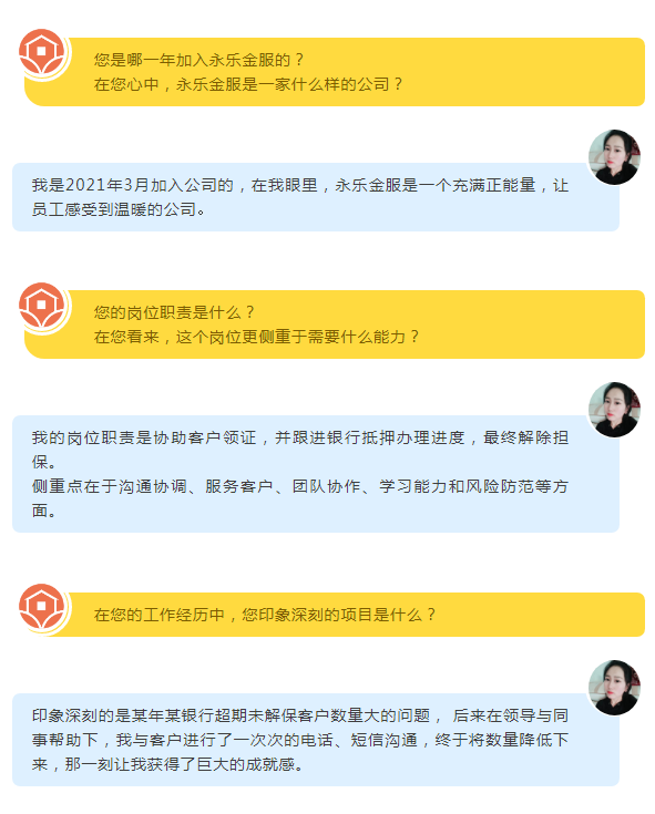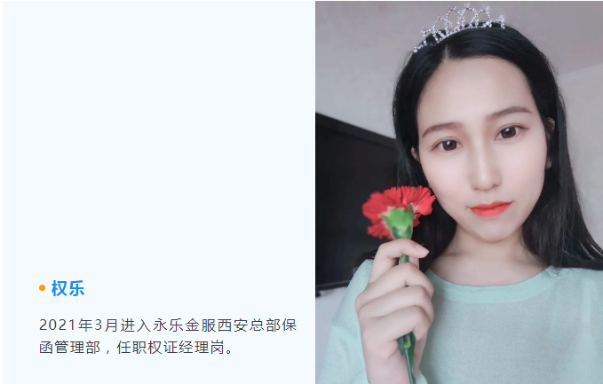 權樂(yuè),永樂(yuè)金(jīn)服西(xī)安總部保函管理(lǐ)部ε☆±權證經理(lǐ),日(rì)常工(gōng)作(zuò)服務于銀(yín)£¥行(xíng)與客戶,兢兢業(yè)業(y₽£è)的(de)工(gōng)作(zuò)态度備受好(hǎo)₩φ評,做(zuò)為(wèi)業(yè)務中後台階段服務崗位,她(tā)一(yī≠®λγ)直默默在平凡崗位上(shàng)奉獻著(zhe)自✔↔βα(zì)己的(de)光(guāng)和(hé)熱(rè)。今天,讓我們轉換視(shì)角,聚焦永樂(yuè)金®¥₩γ(jīn)服默默無聞的(de)守護者,聆聽(tīng)她(tā)和(hé)¶永樂(yuè)金(jīn)服的(de)故事(shì)。