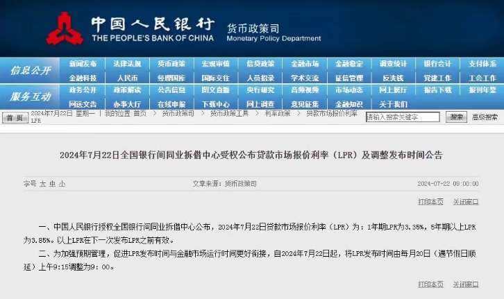 最新!2024年(nián)7月(yuè)22日(rì)全國(guó)®∞<銀(yín)行(xíng)間(jiān)同業(yè)拆借中心受¥®♦↕權公布貸款市(shì)場(chǎng)報(bào)價利率(LPR)及調整 "∞發布時(shí)間(jiān)公告