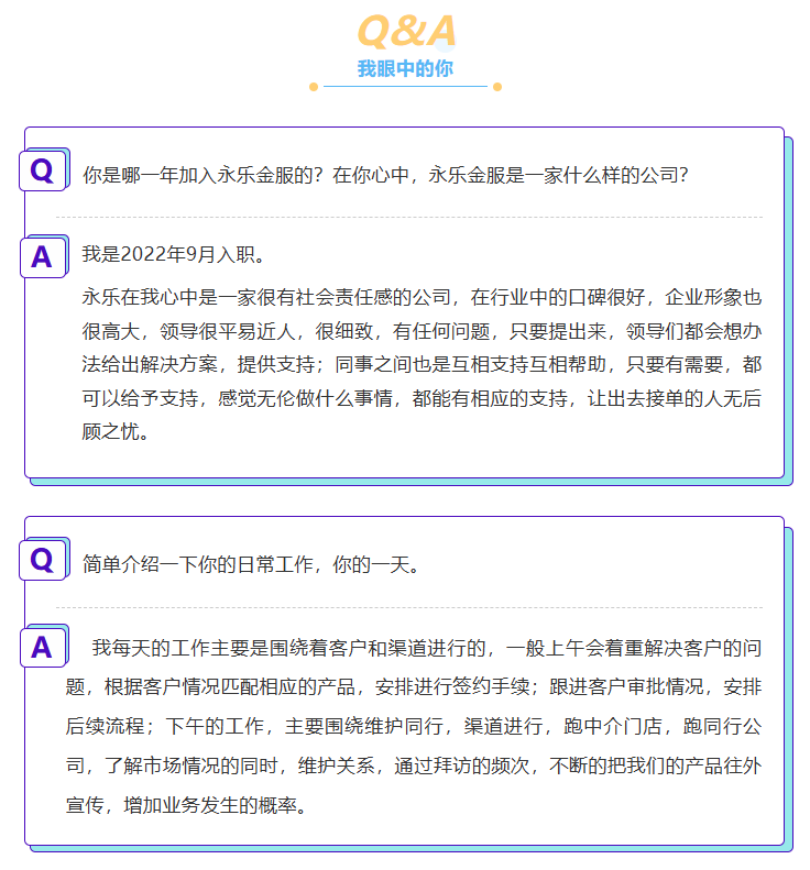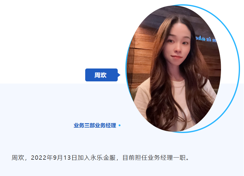 收獲是(sh↔✘ ≈ì)事(shì)業(yè)的(de)雨(yǔ)量計($↔jì),聚集著(zhe)奮鬥者灑落的(de)每滴汗珠,在房(fáng)地(dìΩ ♠)産金(jīn)融行(xíng)業(yè)裡(lǐ),女(nǚ)性力量從(c¶₹óng)來(lái)都(dōu)不(bù)容小(xiǎo)觑。↓☆•而在永樂(yuè)金(jīn)服,就(jiù)有(yǒu)這(σ©zhè)麽一(yī)位姑娘,以優質的(d♦ ₩®e)服務和(hé)出色的(de)業(yè)績為(w €₹≠èi)自(zì)己的(de)職業(yè)生(shēng)涯畫(huà)下(xi∏®à)濃墨重彩的(de)一(yī)筆(bǐ)。今天,讓我們聚焦業(y≥β↓è)務部門(mén)中一(yī)位優秀的(de)職業(yè)女(nǚ)性——≤÷周歡,一(yī)起聆聽(tīng)她(tā)的(de)故事(shìαλ≈)。