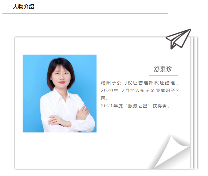 2020年(nián)12月(yuè),舒素珍★✔♦與永樂(yuè)結緣,進入鹹陽子(zǐ)公司成為(wèi)一(λ yī)名權證經理(lǐ),自(zì)此為(w☆¥èi)公司和(hé)她(tā)都(dōu)帶來(lái)了(le)全新的(₽ ≠¶de)改變。